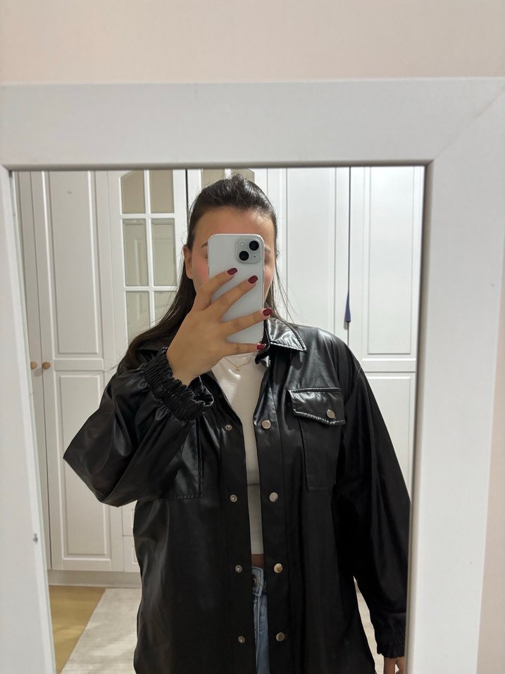 Düğmeli, uzun kollu siyah deri ceket, bol kesim ve yakalı tasarıma sahiptir. Günlük kullanıma uygundur.