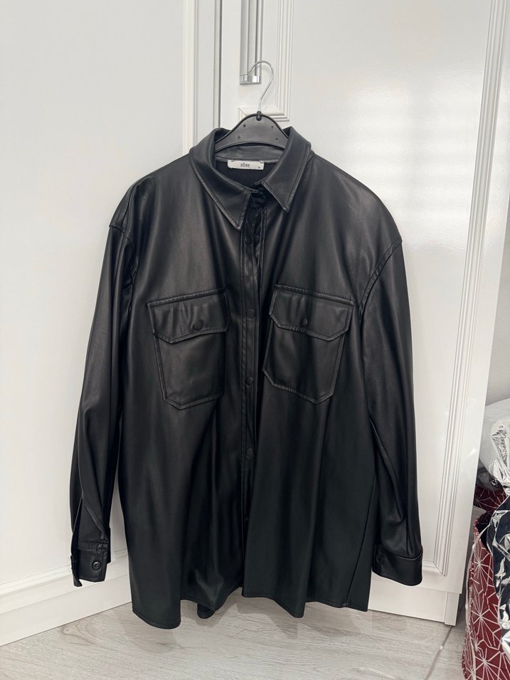 Siyah deri, düğmeli, uzun kollu, yakalı ve normal kesim kadın ceket. Minimalist, günlük kullanıma uygun sokak stili.