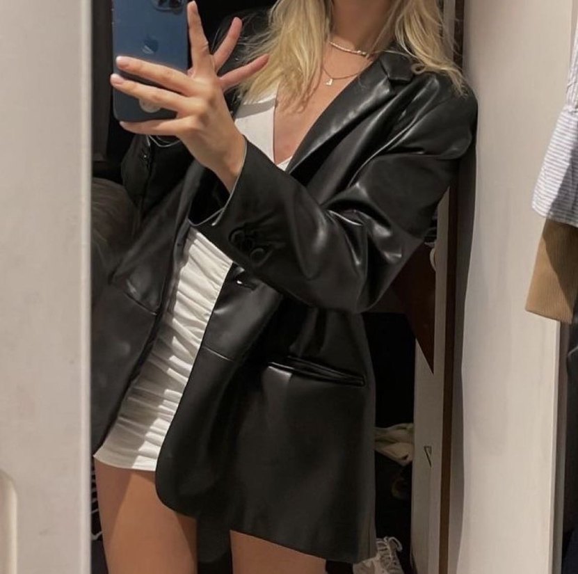 Düğmeli önden kapamalı, yakalı siyah deri ceket. Uzun kollu, vücuda oturan kesimiyle günlük kullanıma uygun.