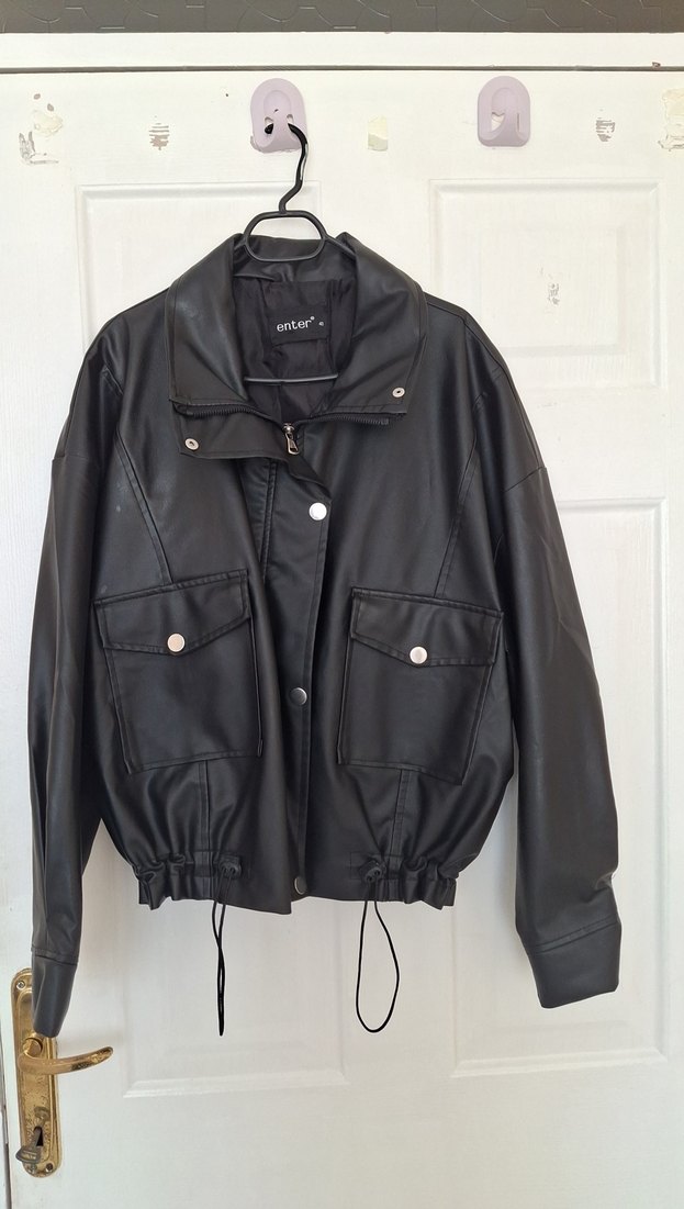 Düğmeli, siyah deri kadın ceket. Gevşek kesim, notalı yaka ve askılı kollara sahip. Elastik bel ve ön cepler bulunur. Günlük sokak stili için uygun. 40 beden ama 36 bedenım oversize gıydım için bana bıle oluyo 2 3 kere giyıldı hıç bır sorunu yok ayarlanabılır lastık