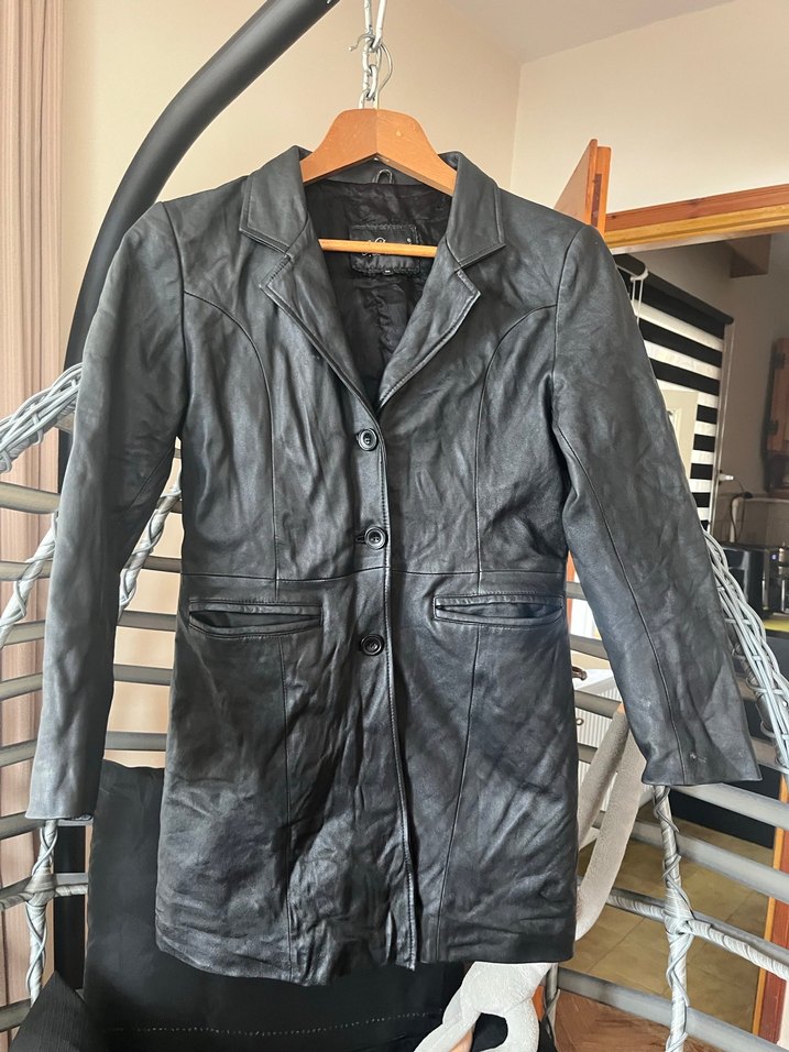 Düğmeli, siyah deri ceket, kesik yakalı ve uzun kolludur. Midi boyda, normal kesim ve günlük kullanım için uygundur. Sokak stili için ideal. Hataları belirttim