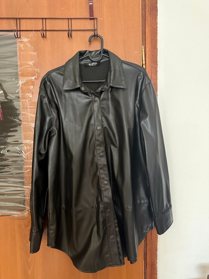 Siyah deri ceket, düğmeli ön, notched yaka ve uzun kolludur. Orta uzunlukta, regular fit ve minimalist tarzda, ofis ve günlük kullanım için uygundur.