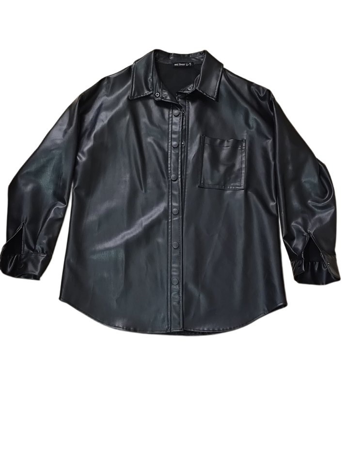 Düğmeli ön, uzun kollu ve yakalı siyah deri kadın ceket. Salaş kesim ve normal midi boy, sokak stili ve günlük kullanıma uygun.