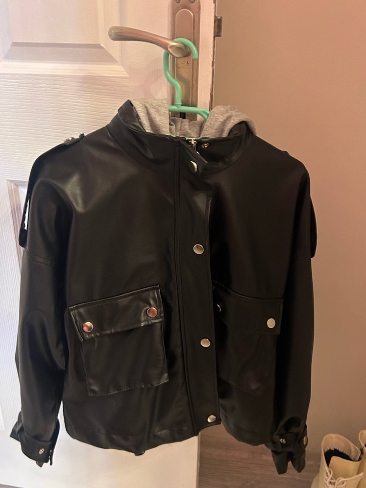 Düğmeli, kapüşonlu, uzun kollu siyah deri kadın ceket. Gevşek kesim, midi boy, sokak stili. Günlük kullanıma uygun.