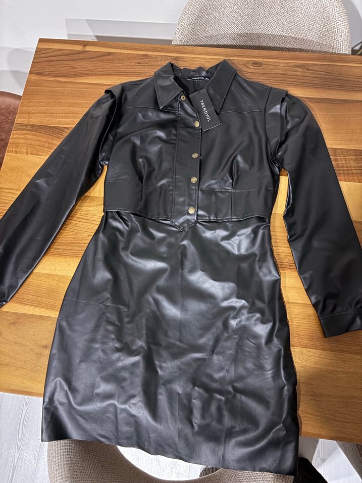 Düğmeli, kesimli siyah deri kadın elbise. Uzun kollu ve uzun boylu, gotik sokak stili için uygun.