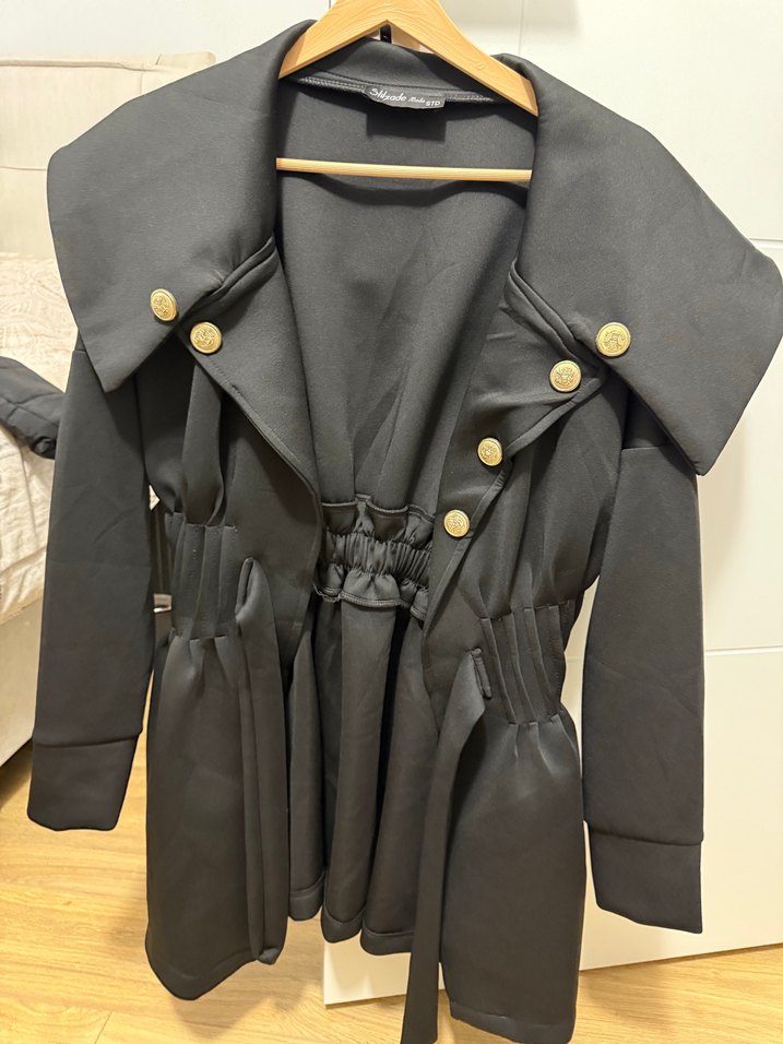 Düğmeli ön kısmı, keskin yaka ve uzun boyuyla siyah deri, dar kesim kadın kabanı. Ofis için uygun, askılı kollu detaylarla.