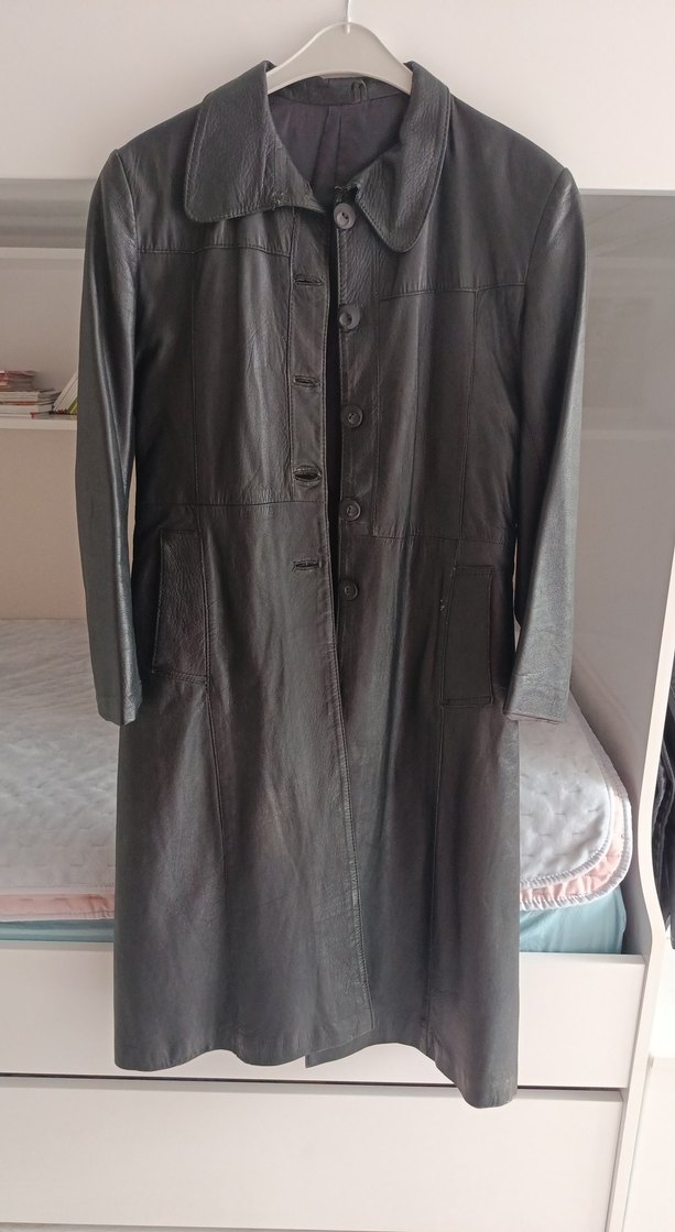Düğmeli, siyah deri uzun kaban, keskin yakası ve uzun kollu tasarımıyla ofis şıklığına uygun, düz ve regular fit modeldir.