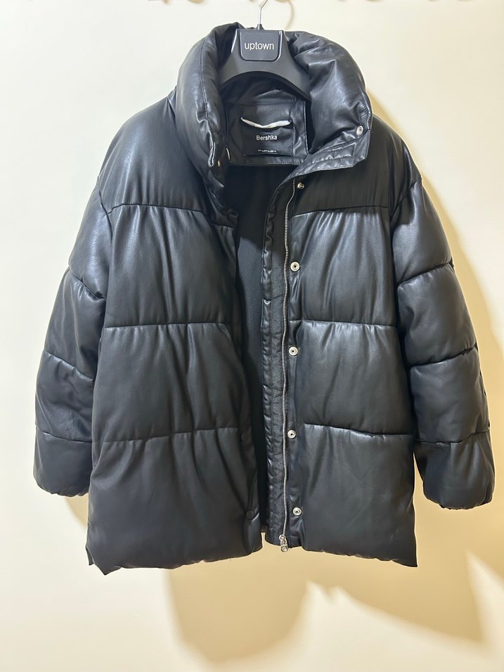 Düğmeli Siyah Deri Kadın Mont bershka