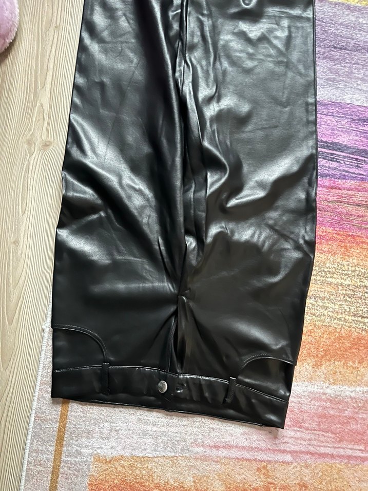 Düğmeli detaylara sahip uzun siyah deri pantolon. Sokak stiline uygun, gündelik kullanıma ideal, desensiz tasarım.