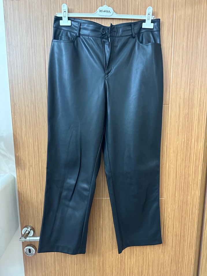 Düğmeli, siyah deri kadın pantolon. Normal uzunlukta, midi kesim ve regular fit. Ofis ve sokak stili için uygun. 38-40 beden uyumludur
