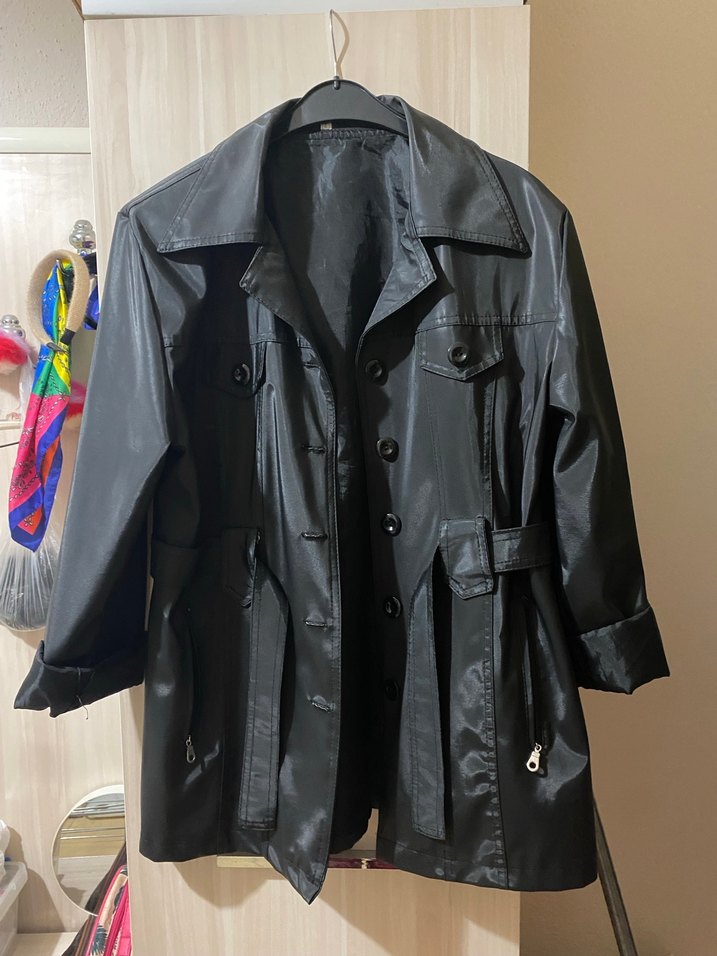 Düğmeli Siyah Deri Kadın Yağmurluk