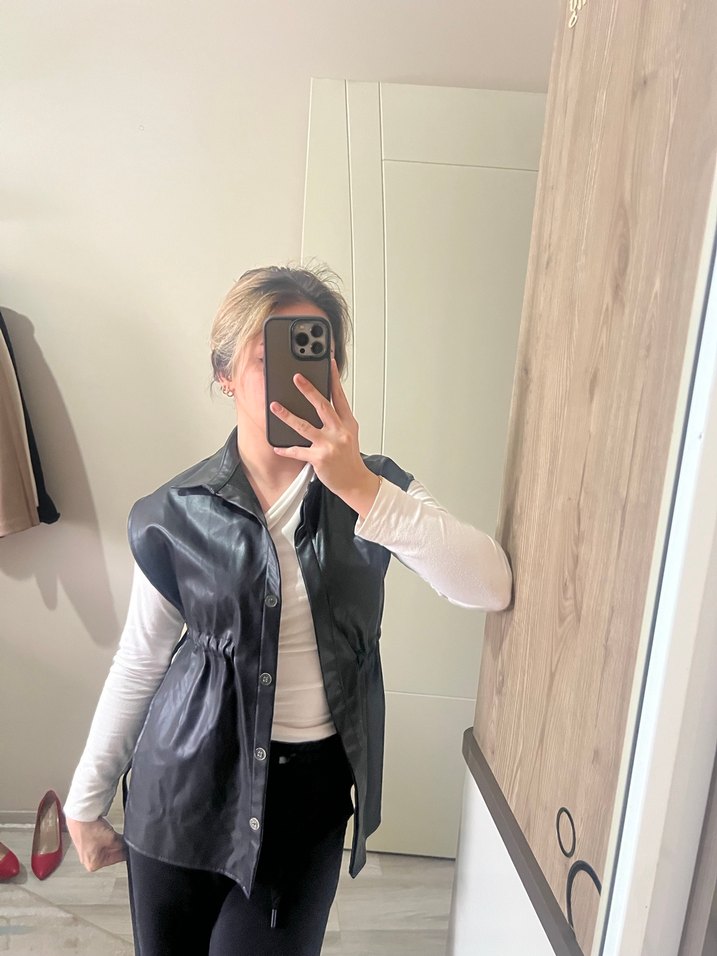 Düğmeli, belden büzgülü, salaş kesim siyah deri kadın yelek, sokak stili için uygun.