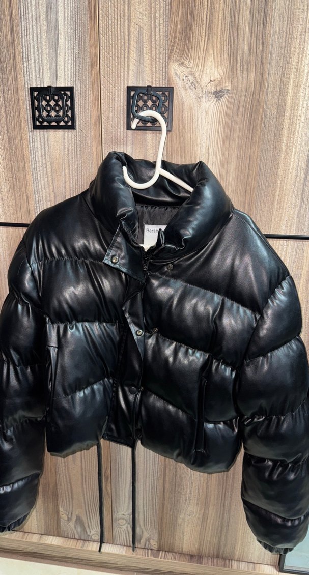 Yüksek yakalı, düğmeli siyah deri kısa mont. Mini ve fitted kesimi, strappy kollu, genç ve trend sokak stili için ideal.