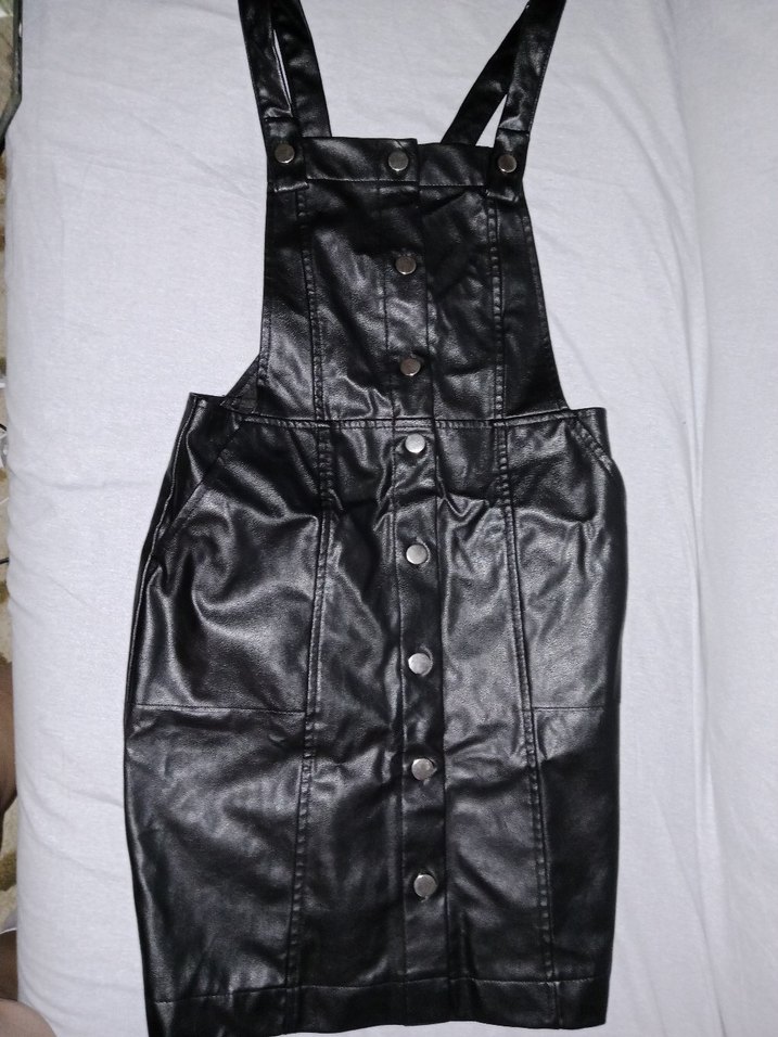 Düğmeli, askılı ve siyah deri kısa tulum, vücuda oturan