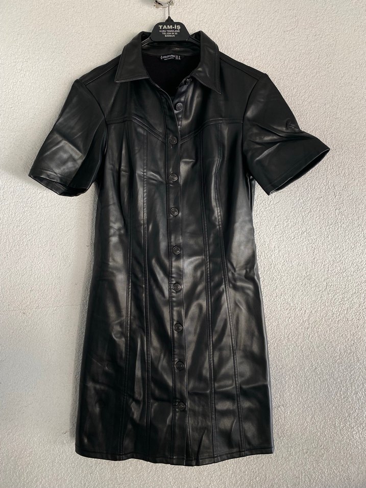 Düğmeli Siyah Deri Midi Elbise
