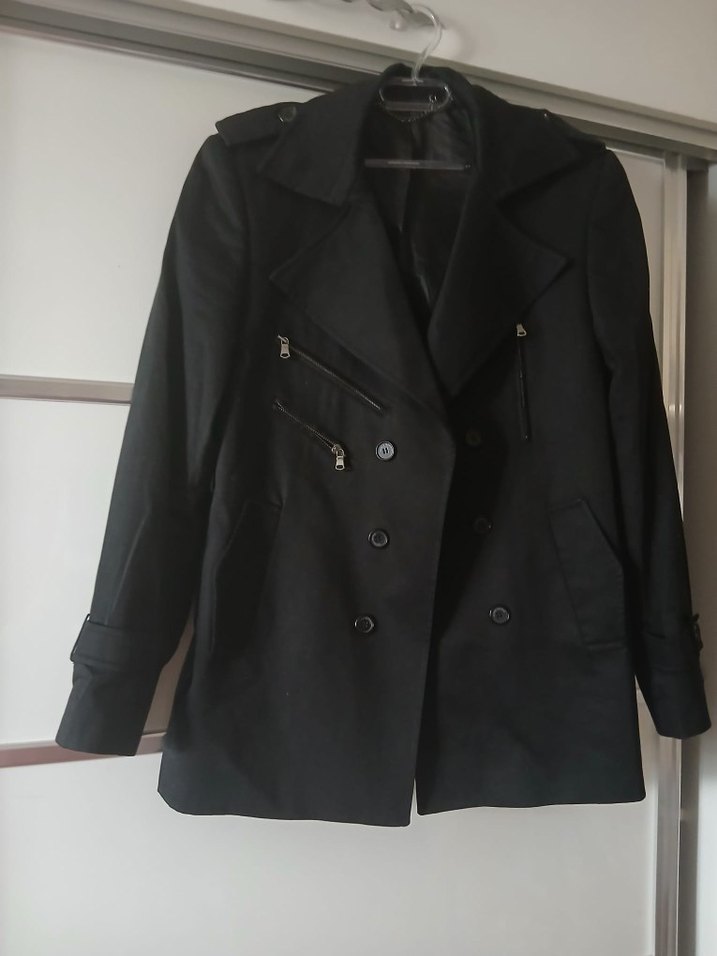 Düğmeli, notched lapel yakalı siyah deri midi ceket, strappy kollu ve regular fit. Trendy casual streetwear için uygundur.