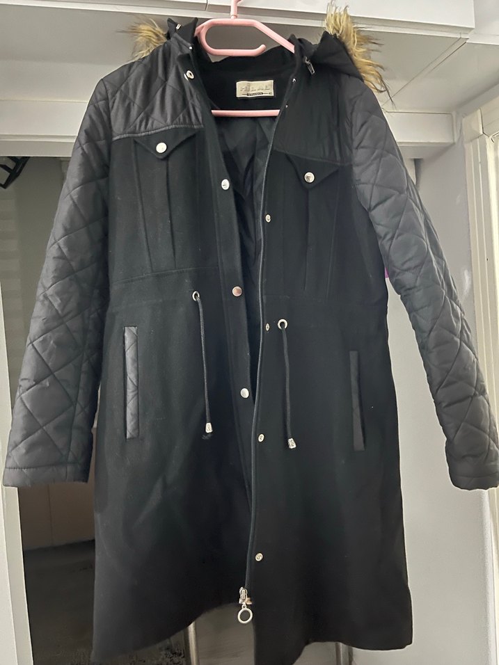Düğmeli, siyah deri midi kadın mont . Uzun kollu, kapitone detaylı kolları ve bel kısmında bağcıklı. Günlük kullanıma uygun, rahat kesim.