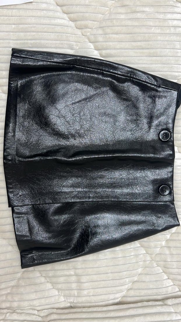 Düğmeli ön kısmı ve parlak, desensiz yüzeyi olan siyah deri, dar kesim mini etek. Gotik tarzda, Parisli avangart dokunuşuyla günlük kullanıma uygun.