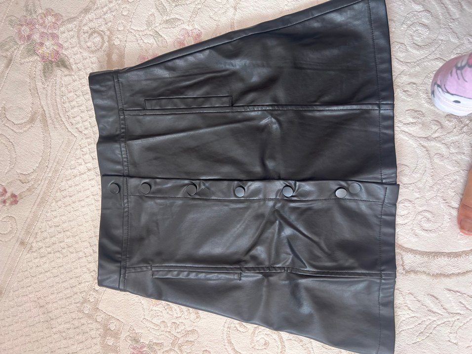 Düğmeli, siyah deri midi şort. Fitted kesim, desen yok, günlük kullanım için uygun, gotik tarzda.