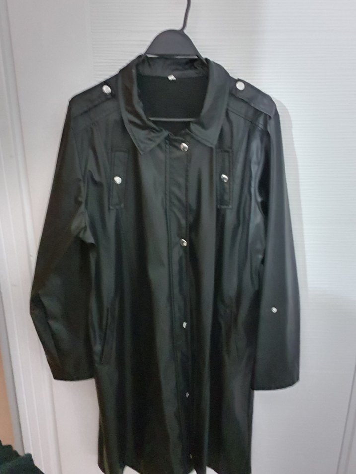 Siyah deri midi yağmurluk, düğmeli ve kesimli yaka detayına sahiptir. Uzun kollu ve bol kesimdir, günlük kullanıma uygundur.