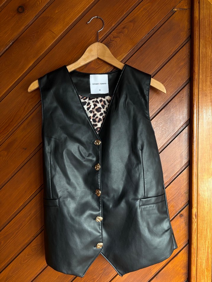 Düğmeli, siyah deri, kolsuz yelek. Leopar desenli astarı, normal kesim ve midi boyu ile günlük kullanıma uygun.