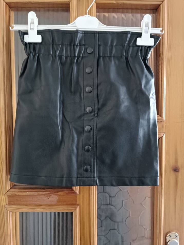 Düğmeli Siyah Deri Mini Etek