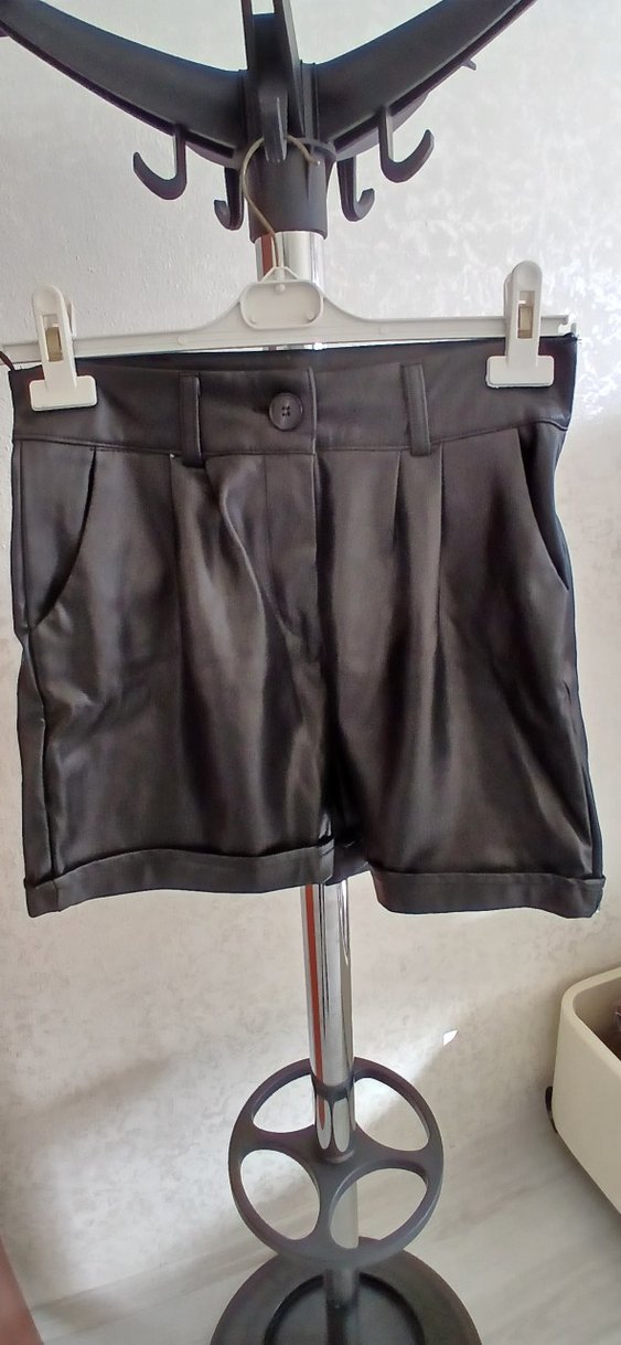Düğmeli, fitted kesim siyah deri mini şort, şık sokak stiliyle günlük kullanıma uygun.