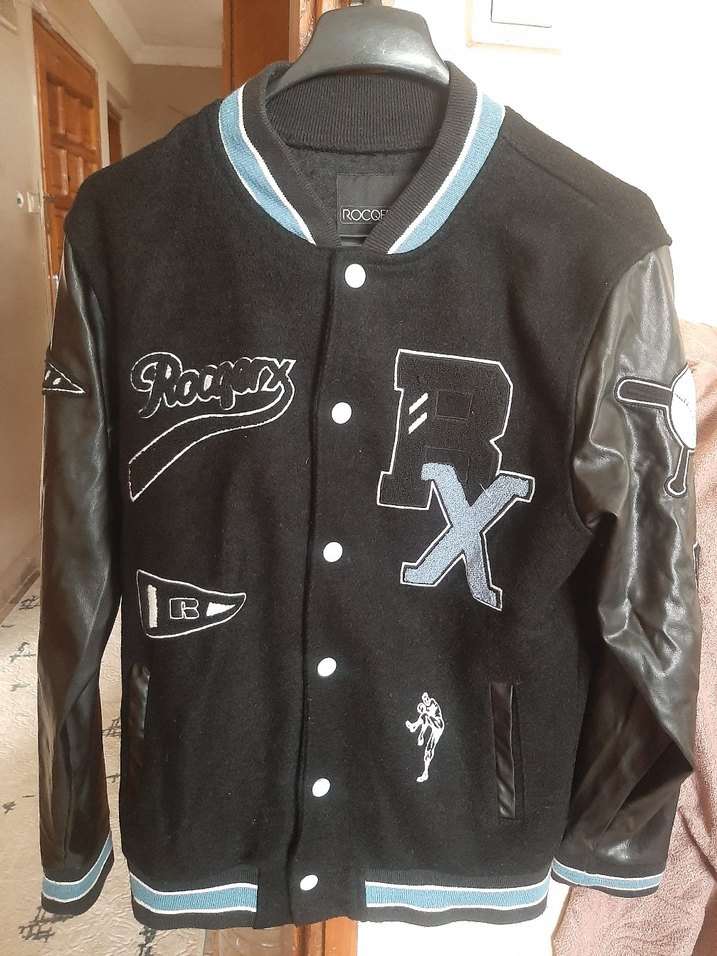 Düğmeli, baskılı detaylara sahip siyah deri unisex ceket. Uzun kollu, yuvarlak yakalı ve bol kesim, sokak stili için uygun.