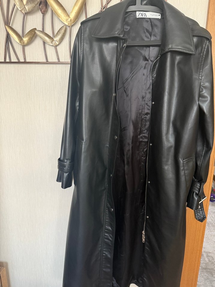 Siyah deri uzun ceket, düğmeli ön ve notched yaka ile. Strappy kollu, regular fit, sokak stiline uygun. 1 kez giydim iade almıyorum ( Kemer yeri var ama mağazadan alırken üstünde yoktu )
