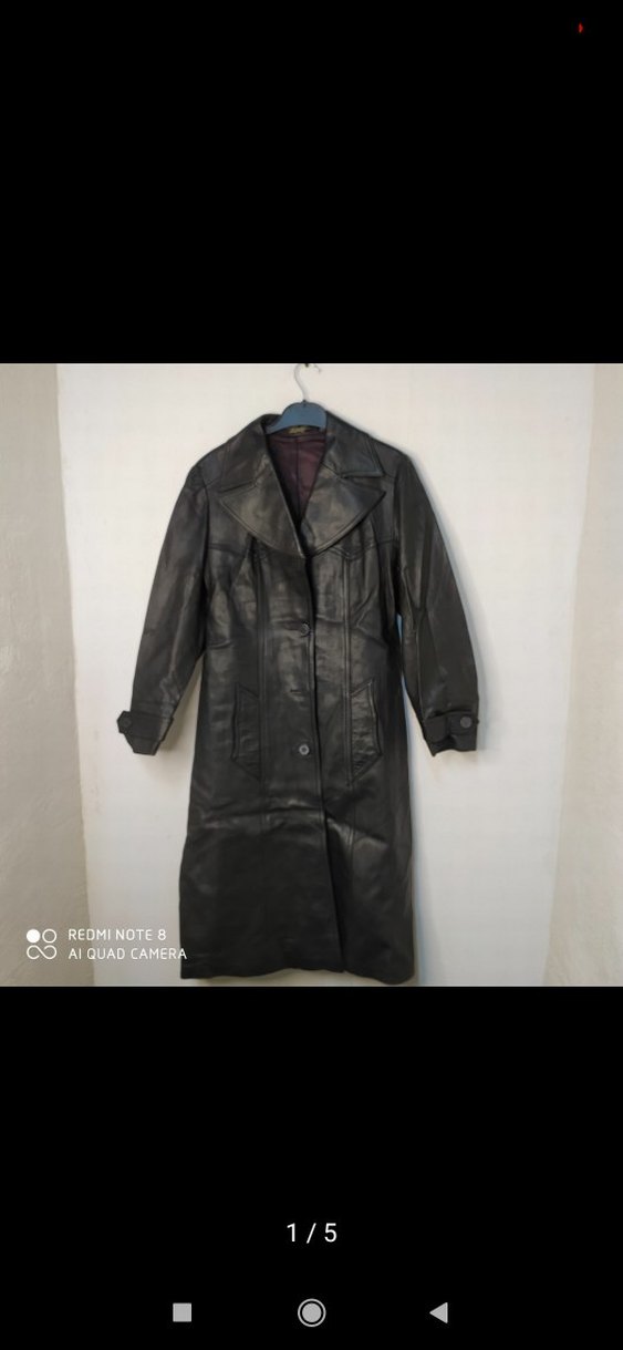 Siyah deri uzun ceket, düğmeli ve yakalıdır. Uzun kollu ve klasik goth tarzında, rahat kesimdir.