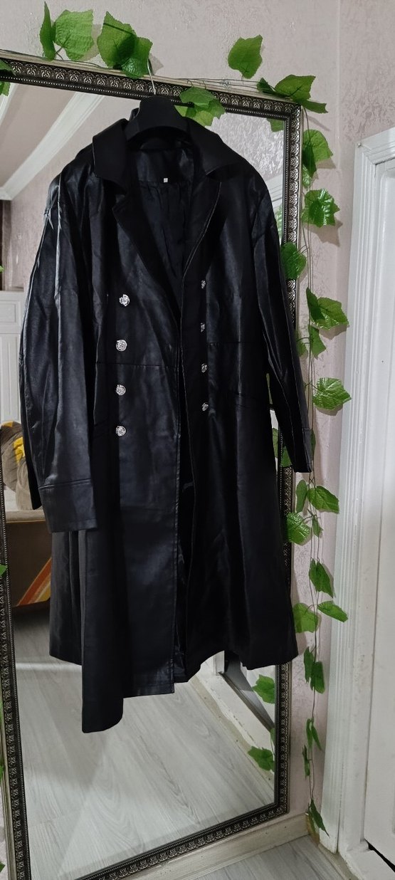 Siyah, düğmeli, uzun deri pardösü. Notlu yaka ve uzun kollu, düzenli kesimle gotik ve avangart tarz için uygundur. büyük bedendir 2XL harika kalın tok bir kumaşı var