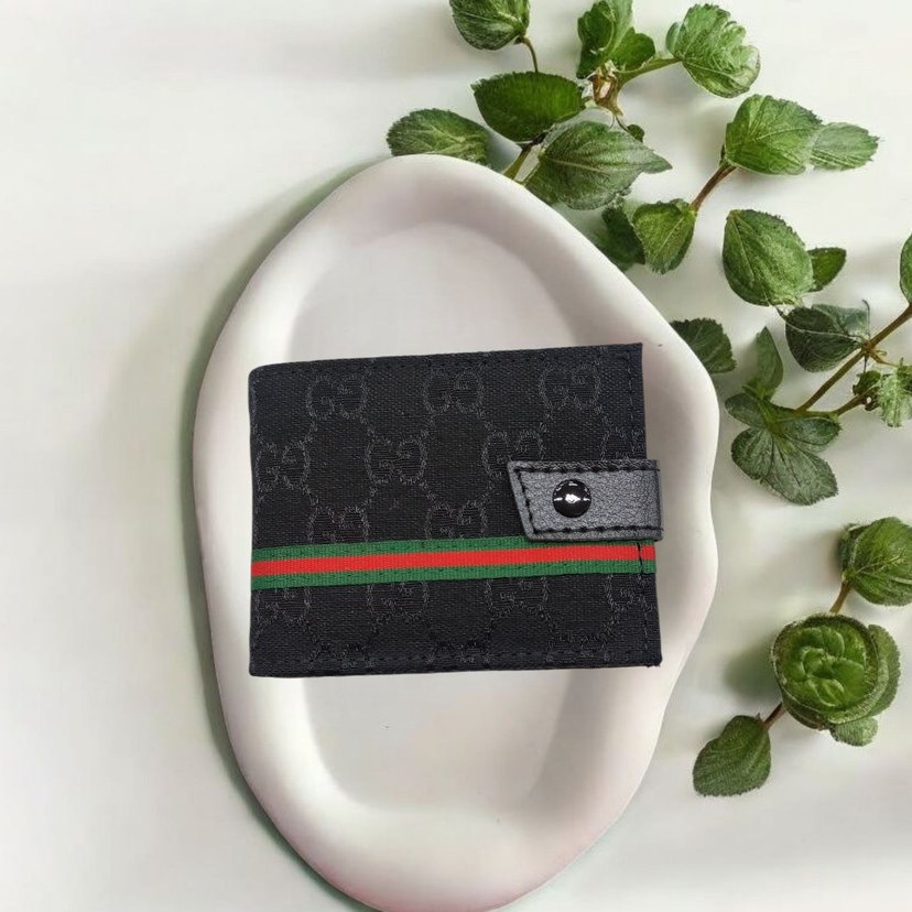 Düğmeli siyah erkek cüzdan, baskılı desene ve yeşil-kırmızı şerit detayına sahip. Minimalist, trend sokak stili tasarım.