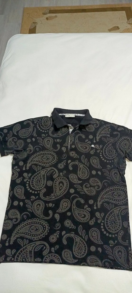 Siyah renkte, düğmeli ve yakalı erkek polo tişört. Sentetik kumaştan, bol kesim ve baskılı desenli, günlük sokak stiline uygun.