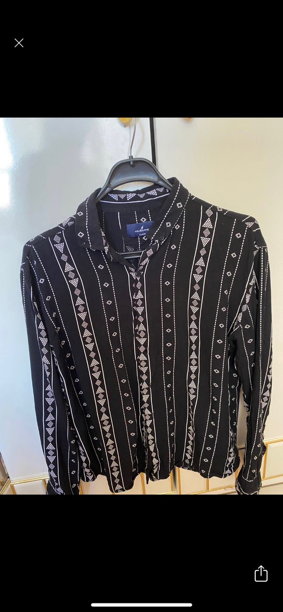 Düğmeli, uzun kollu, yakalı ve siyah desenli kadın gömleği. Rahat kalıbı ve günlük kullanım için uygundur.