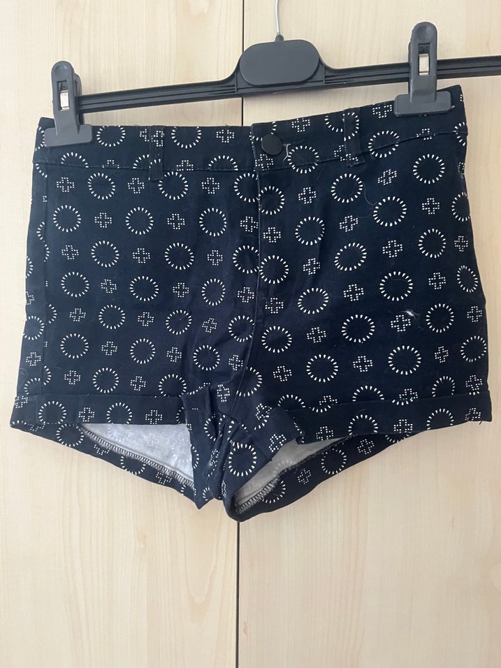 Düğmeli, siyah renkli, puantiyeli desenli, dar kesim mini kot şort, günlük rahat sokak stili için uygundur Nerdeyse hiç giyemedim tatillerde çok güzel olur.