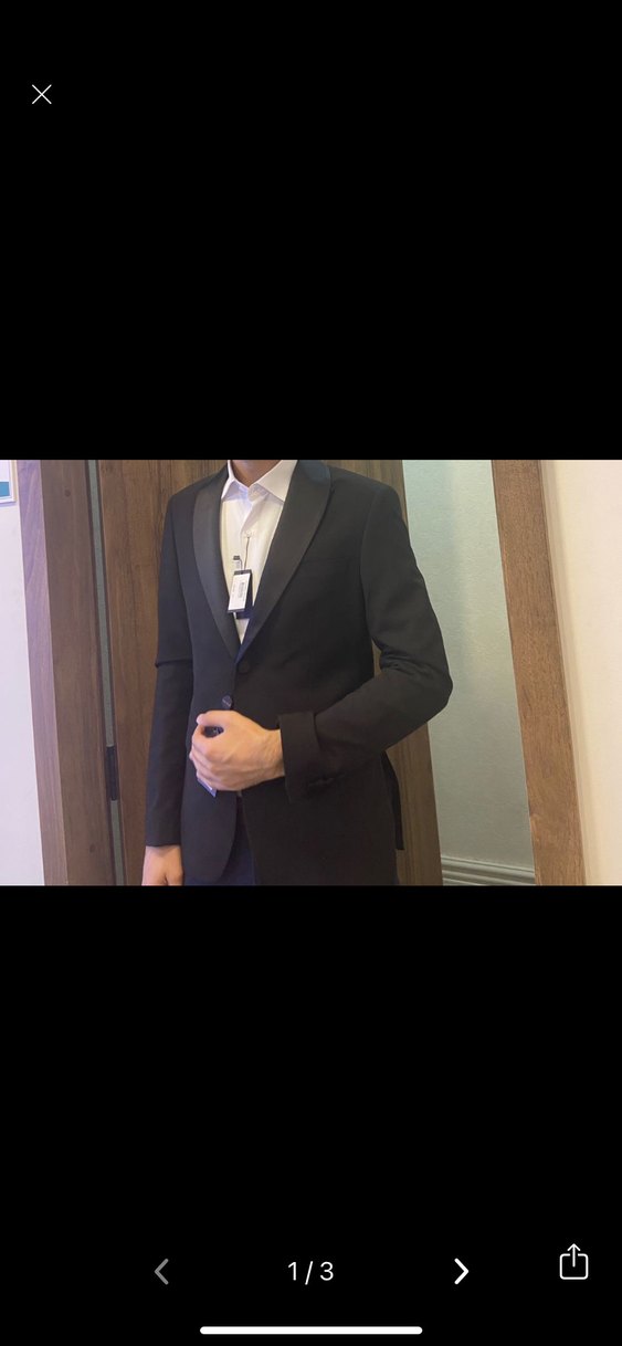 Düğmeli, siyah renkli, düz desenli takım elbise. Notch yakalı, uzun kollu, klasik modern stil ve normal boy kesimdir.