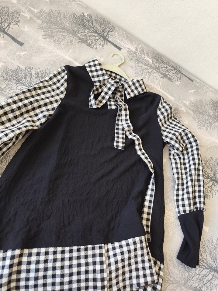 Düğmeli, uzun kollu, yakalı ve bol kesim bluz. Siyah ve ekose desenlerle günlük şık bir görünüm sunar.
