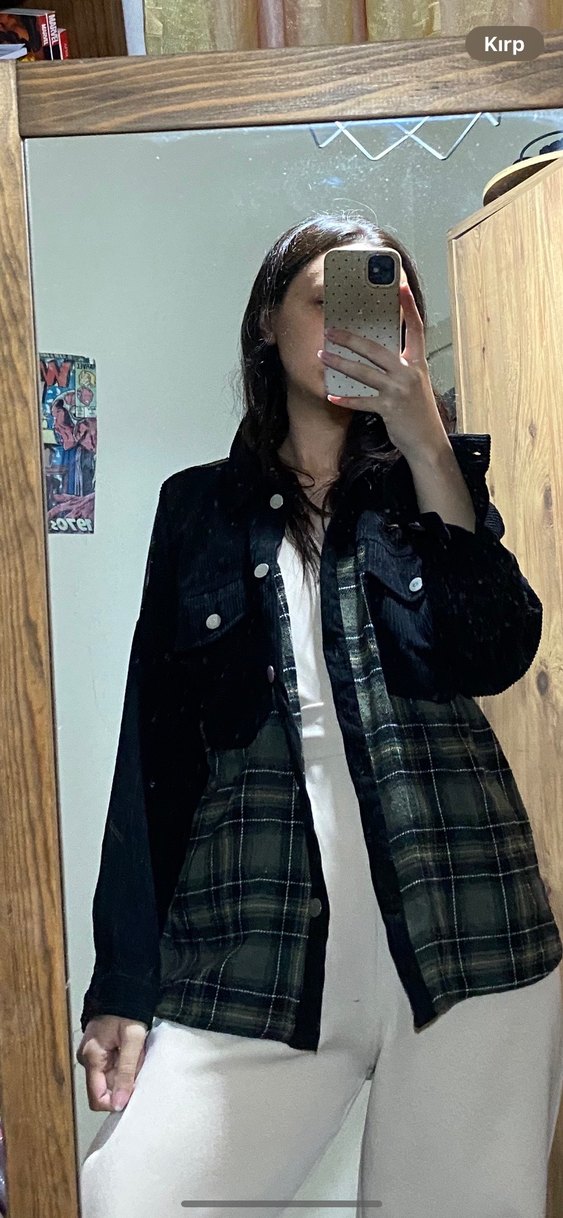 Düğmeli, uzun kollu, siyah ekose desenli bol kesim denim gömlek. Günlük sokak stili için uygun.