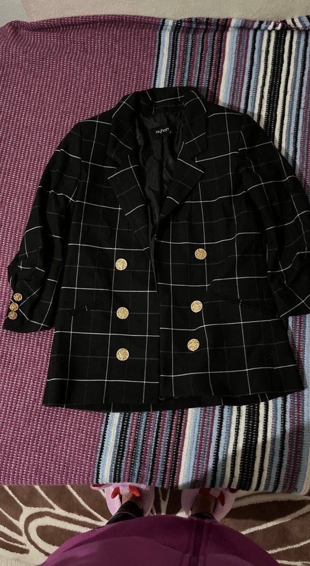 Düğmeli Siyah Ekose Kadın Blazer Ceket