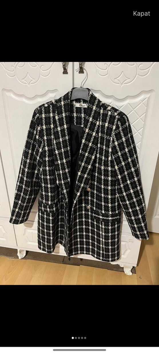 Düğmeli, uzun kollu siyah ekose blazer ceket, normal boy ve regular fit. Ofis ve günlük kullanıma uygun, sentetik kumaştan üretilmiştir.