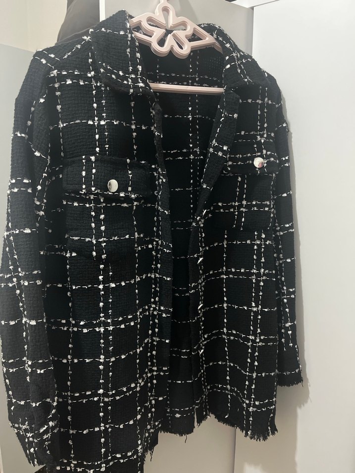 Düğmeli ön ve kesik yakalı bu siyah ekose kadın ceket, normal boyda ve uzun kolludur. Sentetik kumaştan, rahat kesimdir. Trend sokak stili için uygundur.