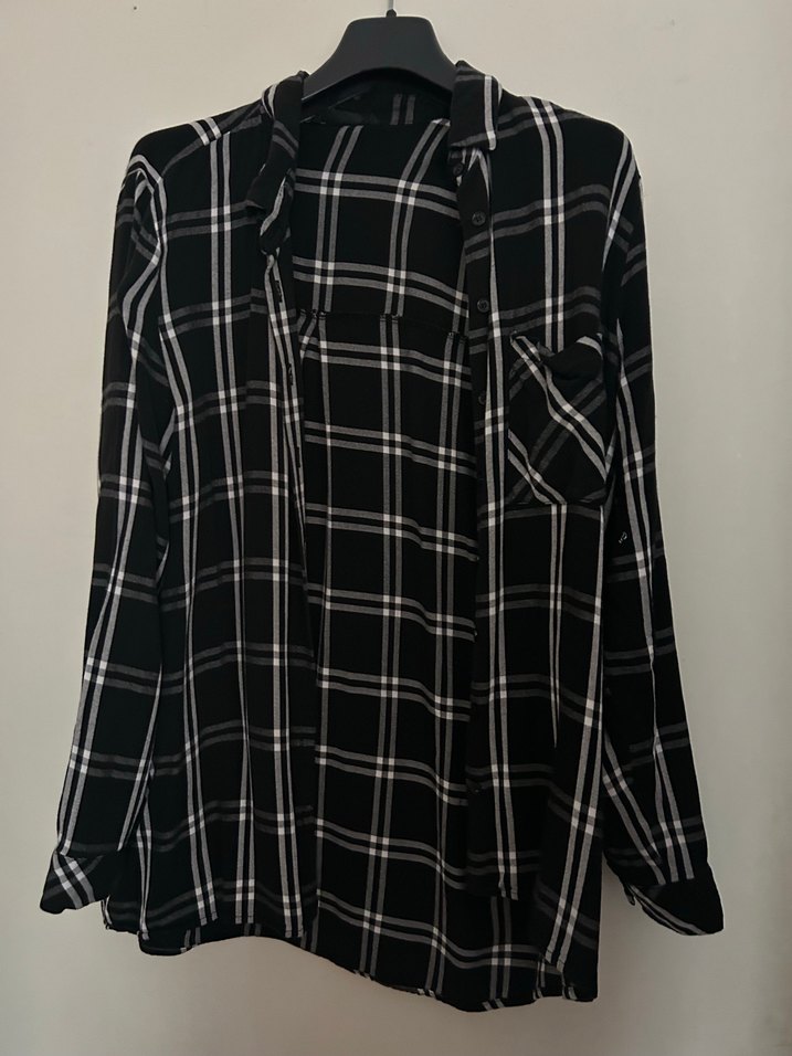 Düğmeli, uzun kollu, yakalı ve bol kesim siyah ekose kadın gömleği. Sentetik kumaştan, günlük kullanıma uygun sokak stili gömlek.
