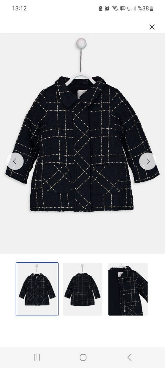 Düğmeli ve kesik yakalı, lacivert ekose desenli kız çocuk mont. Uzun kollu, normal kesim ve yumuşak, sıcak dokulu kumaştan üretilmiştir. lacivert ustune gold simli cizgilidir. isik yansimasindan renk soluk cikti fakat tam canli laciverttir. ici polarli kalindir. sapkasiz. hic kullanilmadi tertemiz deformesi vs yoktur. boy 54 cm