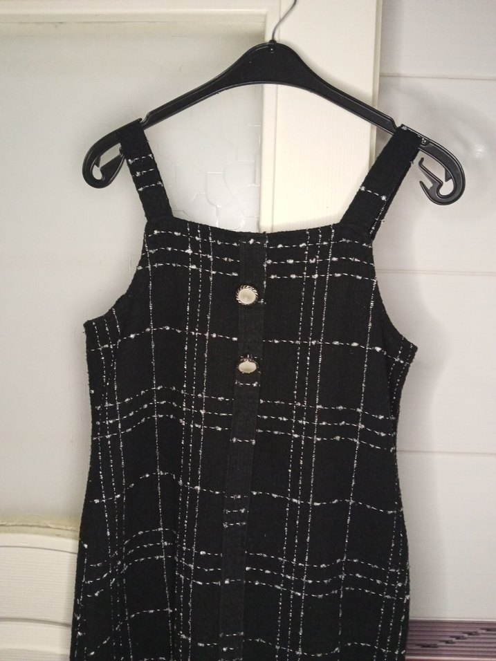 Siyah ekose desenli, düğmeli, askılı kol ve kesik yaka detaylı, sentetik kumaştan yapılmış, normal boyda, regular fit tulum.