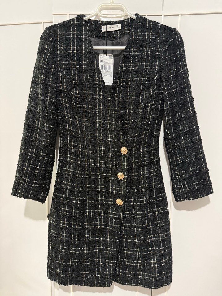 Düğmeli, siyah ekose desenli blazer elbise, normal boy ve uzun kolludur. Notched lapel yaka ve rahat kesim ile ofis stiline uygundur.