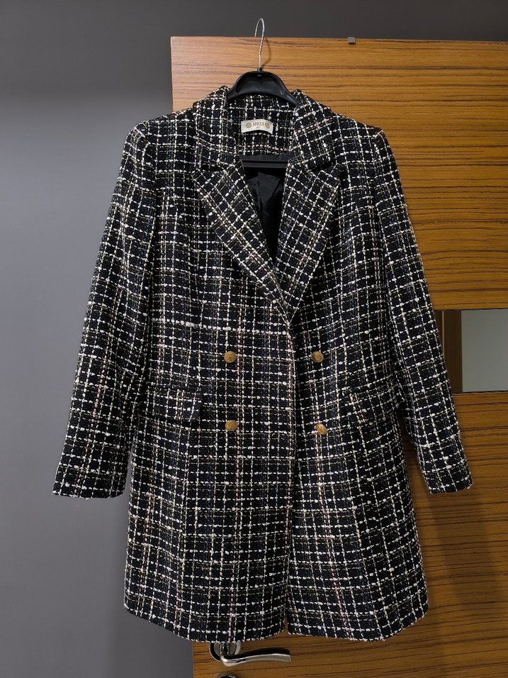 Düğmeli Siyah Ekose Midi Kadın Blazer
