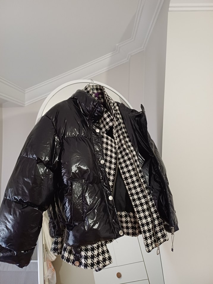 Düğmeli, siyah ekose desenli kadın mont. Yaka detaylı, askılı kollu, bol kesim ve midi boyda, sentetik kumaştan yapılmıştır. Günlük kullanıma uygundur. hic giyilmedi