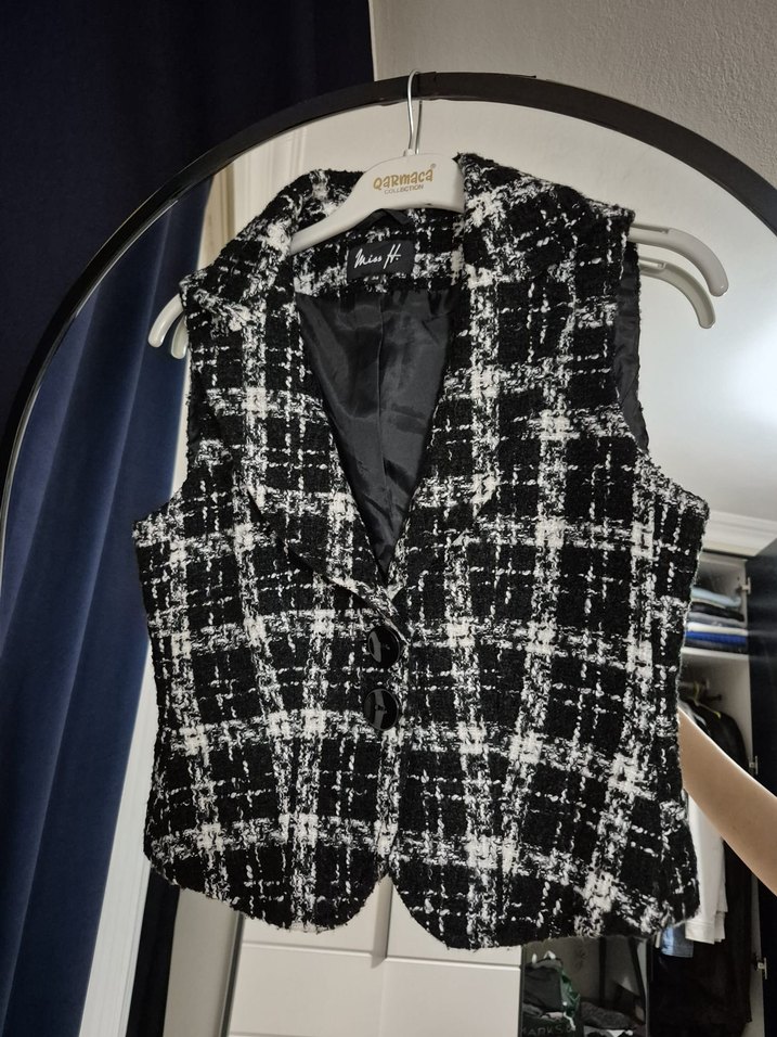 Düğmeli siyah ekose desenli, kolsuz, normal kesim ve notlu yakalı midi yelek. Günlük sokak modasına uygun.
