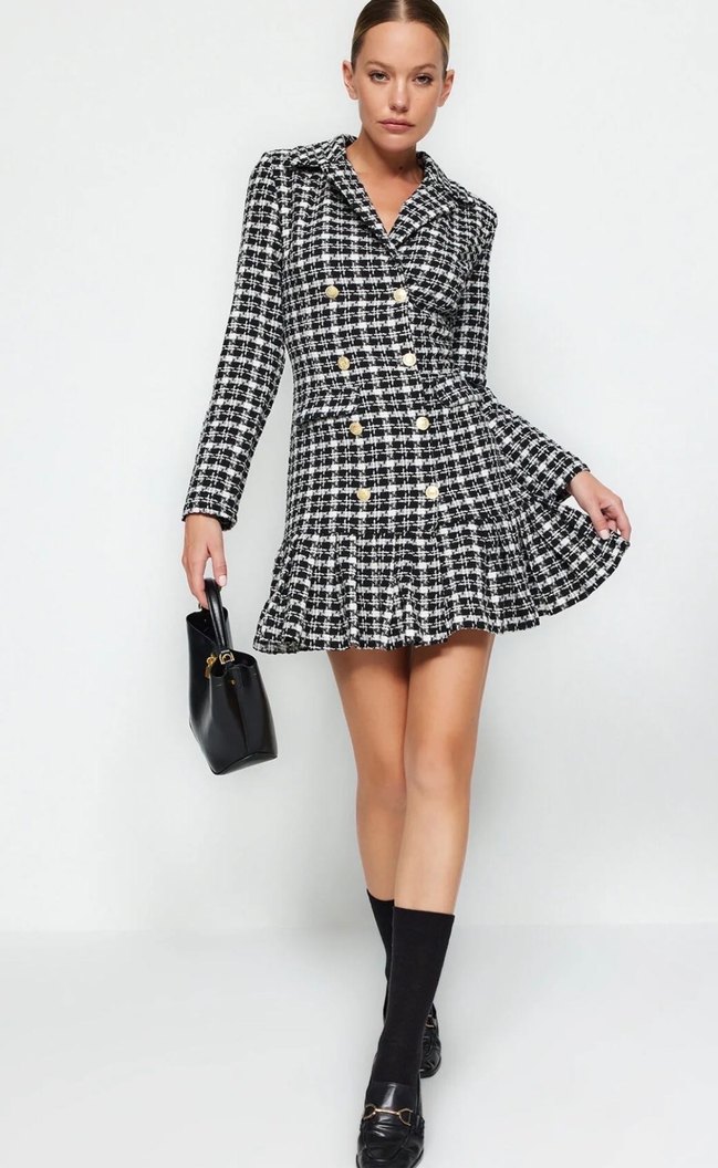Düğmeli Siyah Ekose Mini Elbise