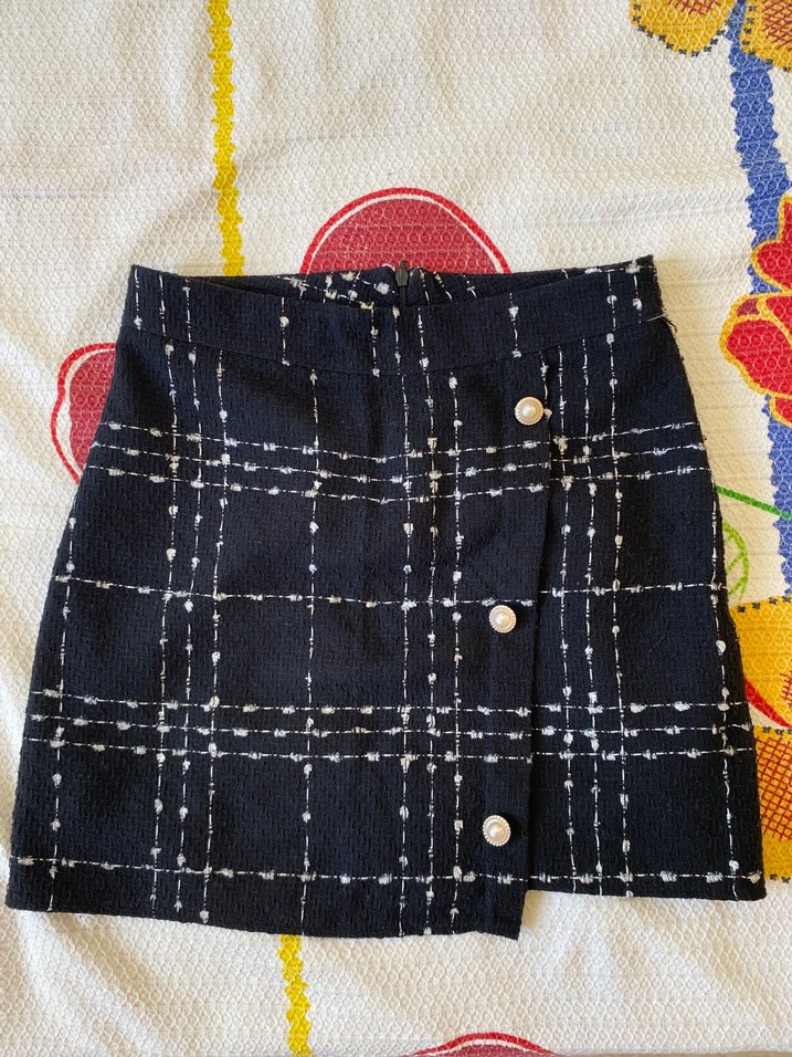 Düğmeli ve ekose desenli siyah mini etek,bir defa giydim kullanmadigim icin satiyorum, s beden